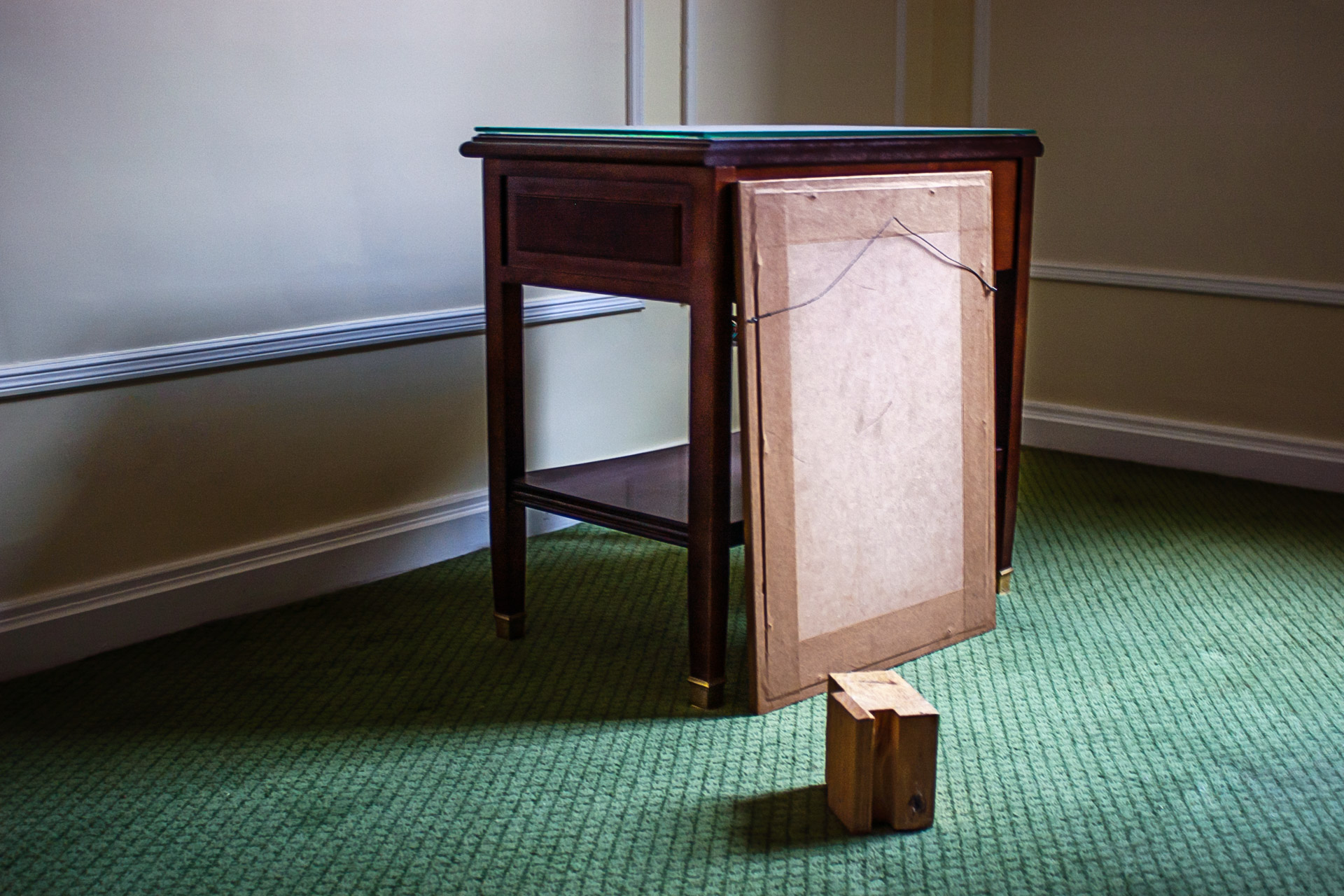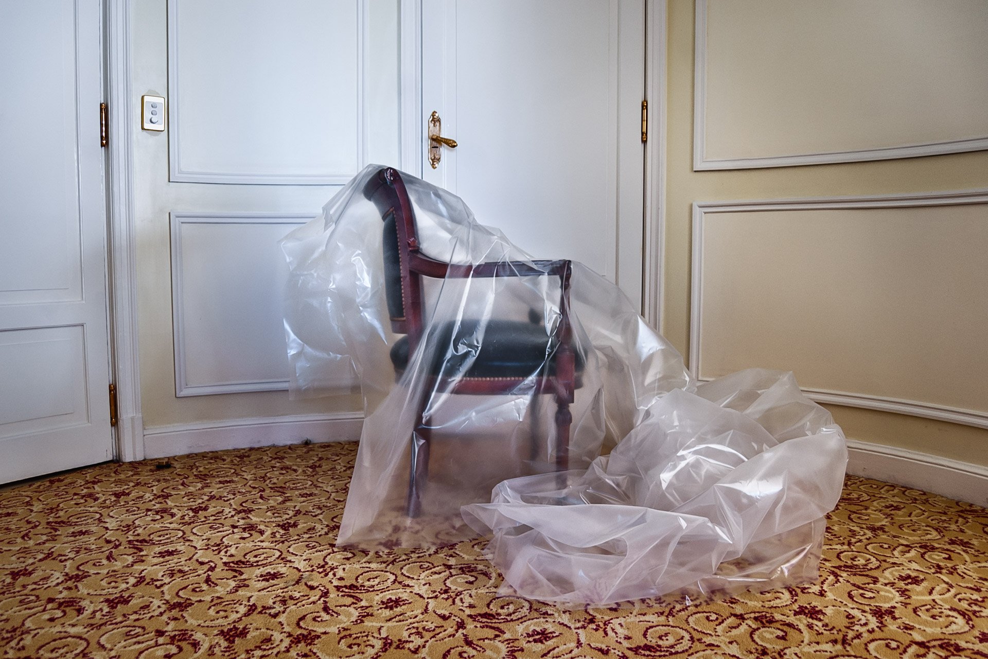 Hotel Palacio es un trabajo realizado en uno de los hoteles de lujo de Buenos Aires. Las imágenes fueron tomadas en habitaciones en proceso de remodelación, en el período que transcurre entre el final de obra y la decoración definitiva. Hotel Palacio es el registro de una indefinición. Es la representación de un orden en un tiempo que pareciera desprendido. Estalla ante la ausencia de lo viejo y un futuro marcado pero todavía ajeno.